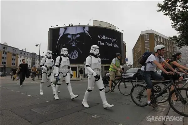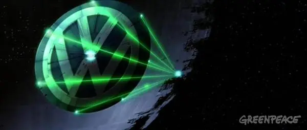 Para poner de relieve el largo historial de oposición de la compañía automovilística a las mejoras en eficiencia energética y en emisiones de CO2, Greenpeace parodió un anuncio de la empresa e introdujo, en la campaña original en la que aparece un mini Darth Vader, un grupo de jóvenes fans de la Guerra de las Galaxias que se enfrentan al Lado Oscuro de Volkswagen mientras que la Estrella de la Muerte de Volkswagen amenaza a la Tierra. Para ello, Greenpeace creó el micrositio El lado oscuro de Volkswagen