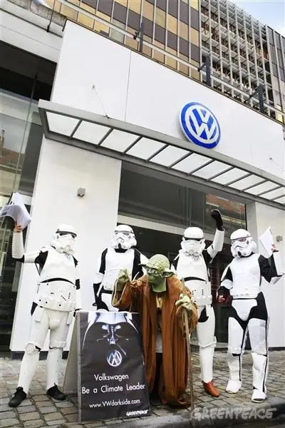 "Volkswagen es tan grande que podría cambiar la industria mundial del automóvil si utilizase su fuerza para dar un impulso a la producción de vehículos menos contaminantes y para favorecer el marco legal necesario para ello, en vez de boicotearlo. Necesitamos la ayuda de todos para alejar a Volkswagen del Lado Oscuro y hacer que sea la empresa responsable con el medio ambiente que sus clientes quieren que sea", declaró Sara Pizzinato, responsable de la campaña de Cambio Climático y Transporte de Greenpeace España.
