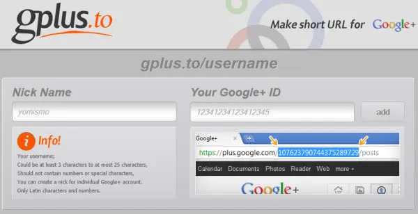 La primera es usar un acortador de direcciones. Uno que se ha hecho muy popular para este uso es Gplus.to. Lo único que tienes que hacer es elegir un usuario y pegar tu ID, para tener una dirección del estilo gplus.to/mi-nombre-de-usuario.