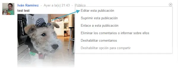 Editar las publicaciones que compartes con tus círculos se consigue con un proceso similar. Primero debes hacer clic en la pequeña flecha que hay en su esquina superior derecha, y después elegir Editar esta publicación.