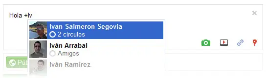 Al igual que en otras redes sociales, en Google+ puedes mencionar a tus amigos en tus actualizaciones y comentarios. Lo único que tienes que hacer es escribir + o @, y empezar a escribir el nombre de tu amigo, para después seleccionarlo en la lista.