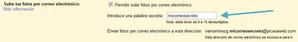 En el apartado Sube tus fotos por correo electrónico, marca la casilla y a continuación introduce una palabra secreta. Uniendo dicha palabra y tu nombre de perfil se generará una dirección de correo única a la que puedes enviar tus fotografías, para que se publiquen automáticamente. Anota dicha dirección y guarda las opciones.
