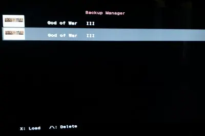 7.- Para cargar culaquier backup ya creado basta con insertar un juego en la consola (se puede utilizar siempre el mismo juego) y desde el menú del Backup Manager seleccionaremos el backup deseado y presionaremos el botón X. También es posible eliminar culaquier backup presionando el botón /.
