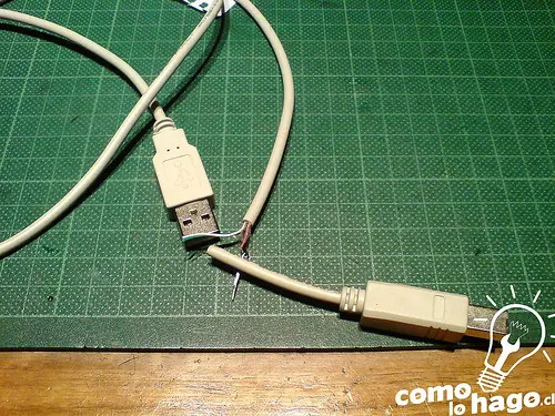 En primer lugar debemos cortar nuestro cable Usb con la precaución de dejar el lado del conector macho de este. (El conector macho es el que se alcanza a ver en la foto anterior). También aprovechamos de pelar el cable para que se puedan observar los cuatro cables que posee dentro.