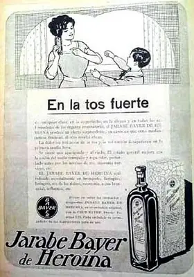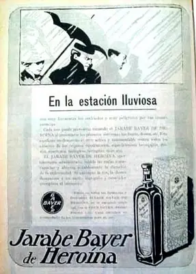 En los diarios aparecen anuncios con escenas cotidianas – una madre que da la medicina a su hijo o unos niños que toman su merienda – y se repite machaconamente el mismo mensaje: “En la estación lluviosa: Jarabe Bayer de Heroína”, “En la tos fuerte; Jarabe Bayer de Heroína”, “La tos desaparece; con Jarabe Bayer de Heroína”.