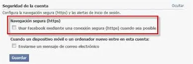 De ahi nos vamos a la opción SEGURIDAD DE LA CUENTA Damos clic en cambiar y se desplazara un menu adicional, de activamos la pesataña NAVEGACION SEGURA (HTTPS) como se muestra en la imagen.