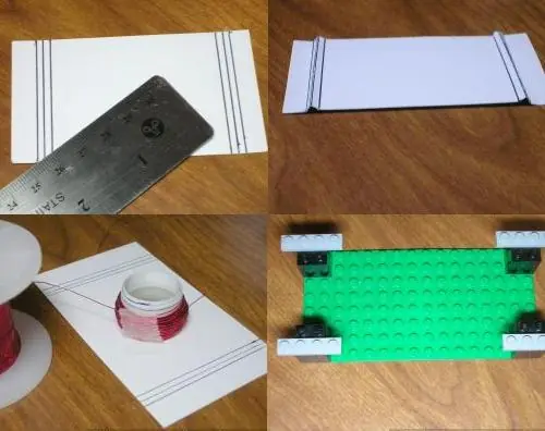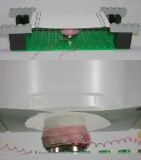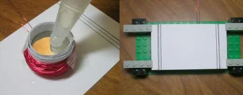 Dibujar tres líneas a cada lado del rectángulo de canson separada la primera del borde de 1 a  1,2 cm y Doblar el rectángulo usando las líneas de referencia. Retirar el imán de los cilindros de papel y pegar estos al centro del rectángulo de canson (Los pegamentos instantáneos funcionan perfectamente). Una vez que el pegamento se seca, poner de nuevo el imán en el interior de los cilindro y comenzar a hacer la bobina alrededor del imán con 40 a 50 vueltas. Y hacer un marco de aproximadamente el tamaño del rectángulo y no mas alto que 2 o 2,5 cm. (En la imagen se muestra con ladrillos de plástico por ser mas sencillo Pero la madera funciona mejor, a tener en cuenta es no usar metales  que puedan ser atraídos por el imán).