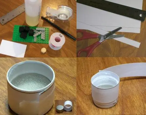 1 Imán de neodimio1 Rectángulo de hoja de canson de 80 x 50 mmAlambre de cobre de 0,2 mm o aproximado (30 a 34 AWG)Papel bondCintaPegamentoMadera (En el proyecto original se realiza con ladrillos plásticos).Vaso de Plástico Para comenzar Cortar dos trozos de papel bond de 28 cm de largo y 1,2 cm de ancho. Y enrollar una de las tiras de papel sobre el imán, utilizando la cinta para sostenerlo (No unir el imán con el papel porque se necesitara separar el imán del papel posteriormente).Enrollar la segunda tira de papel sobre la primera y sostenerla con cinta (Pero no unirla a la primera).