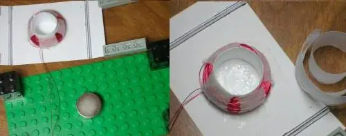 Poner un poco de pegamento sobre el imán cuando esté en el interior del cilindro, sin que este toque el cilindro de papel. Montar sobre la base y dejar que el imán (que tiene pegamento) se pegue a esta.  Esto permitirá que el imán quede exactamente en el centro de la bobina.  Esperar hasta que el pegamento actúe.