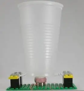 Colocar el vaso (Altavoz) sobre el rectángulo y cortare un agujero sobre el rectángulo como lo indica la foto. Luego, pegar la bobina al centro del vaso y el rectángulo a los costado tal cual lo indica la imagen.