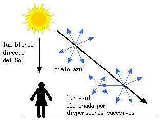 Cada color contenido en la luz blanca se caracteriza por un número que se llama "longitud de onda". La desviación de los colores de la luz es máxima para los azules (con longitud de onda menor), es decir, son los colores que más cambian su dirección con respecto al rayo blanco inicial, y es mínima para los amarillos y los rojos (con longitud de onda mayor), que casi no son desviados. Los rayos azules, una vez desviados, vuelven a chocar con otras partículas del aire, variando de nuevo su trayectoria. Realizan por tanto un recorrido en zigzag a través de la atmósfera, hasta llegar a nosotros. Es por eso que cuando llegan a nuestros ojos parece que llegan de todos los lugares del cielo. Los rayos amarillos no aparecen casi desviados y ésta es la razón de que el sol nos parezca amarillo.