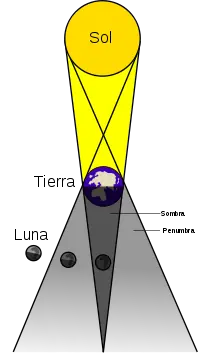 La Luna tiene un radio de 1736,6 km y gira alrededor de la Tierra a una distancia media de 384 403 km (60,27 radios ecuatoriales de la Tierra). La altura del cono de sombra es de 1 384 584 km (217 radios ecuatoriales) que es mayor que la distancia de la Luna a la Tierra, por lo que se producen eclipses.