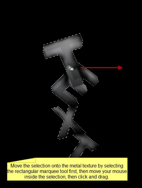 Carga la selección de la capa de texto, a continuación, mover la selección en la textura de metal que ha descargado: (captura de pantalla de abajo para ver instrucciones)