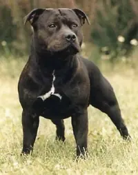 2. Staffordshire Bull Terrier: Es un perro compacto, musculoso y ágil.Es valiente y tenaz. Suele ser amigable con las personas y particularmente con los niños, pero puede ser agresivo con perros y otros animales.