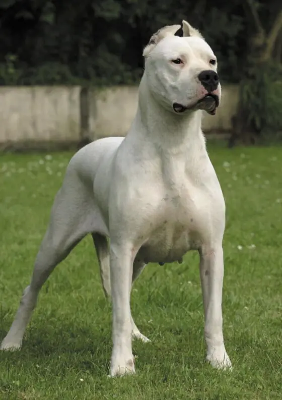 4. Dogo Argentino: Es un perro muy resistente y robusto, de estructura maciza y musculoso. Insensible al dolor, capaz de combatir con animales más grandes que él y matarlos, es fiel a su amo. En casa suele comportarse bien y casi nunca ladra. Es tranquilo y equilibrado. Suele ser agresivo hacia sus congéneres si no es educado correctamente desde temprana edad.