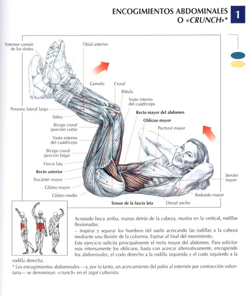 *La principal diferencia entre el Crunch y los abdominales es que en el primero la espalda no debe de separarse del suelo. Esto da un mejor soporte lumbar y evita lesiones de espalda. Además, si se hace correctamente manteniendo el abdomen comprimido en todo momento y la espalda pegada al piso, se involucran la mayoría de los músculos abdominales.