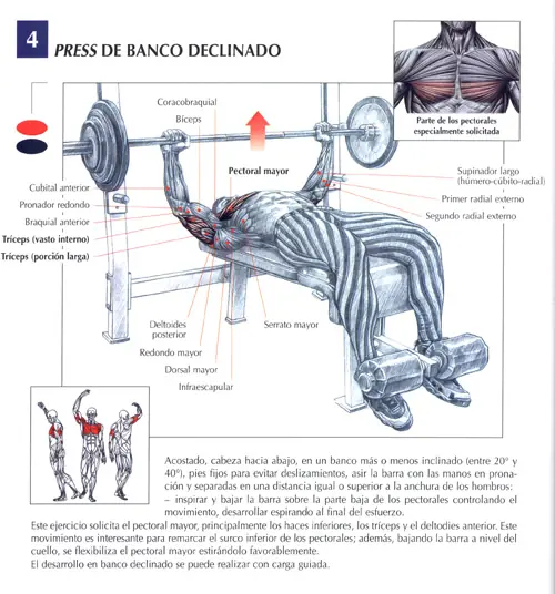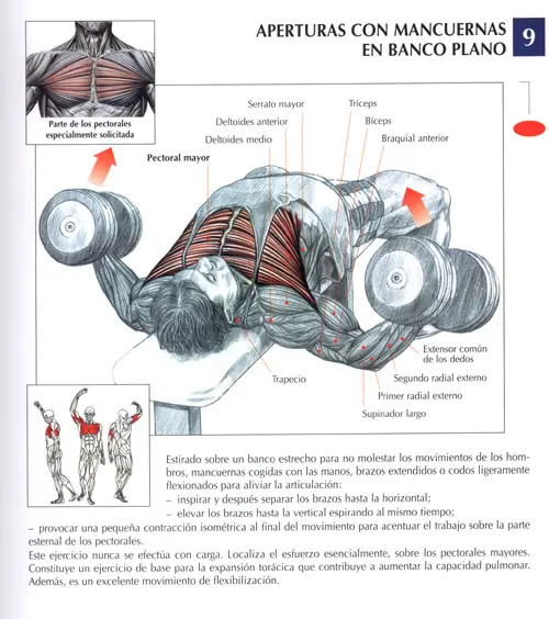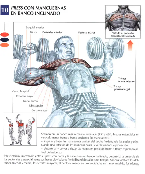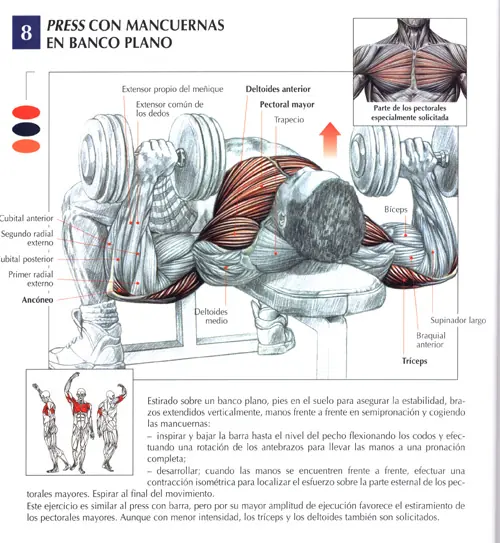 *A pesar de que la mayoría piensa que el press de banca con barra es el mejor ejercicio para ganar masa muscular, el press con mancuernas da un mayor rango de movimiento e involucra menos a los deltoides (hombros).
