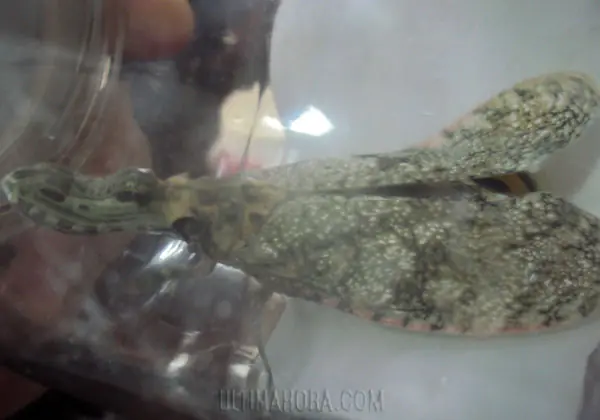 El animalito tiene la cabeza similar al cocodrilo y el cuerpo de una mariposa. Da color verde con puntos y algunas rayas negras en la cabeza y en las alas, con 6 patas coloradas, el bicho nunca fue visto en la zona, según indicaron los vecinos.