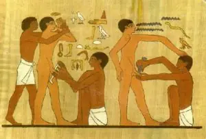 En una de las jambas de la entrada del templo de Menfis se encuentra el grabado más antiguo de una intervención quirúrgica: una circuncisión. De los muchos papiros que se conservan se conocen nueve sobre materias médicas, de los que el más conocido e importante es el bautizado como su descubridor: Georg Ebers.