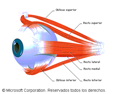 Vista lateral del ojo, donde se puede observar los músculos extrínsecos unidos directamente al globo ocular que permiten el movimiento del ojo. Los cuatro rectos están alineados con sus puntos de origen, mientras que los dos oblicuos se insertan en la superficie ocular formando un ángulo.