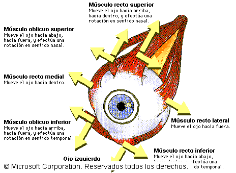 Sólo un objeto cuya imagen se sitúe en el centro de la retina (región de la fóvea) estará enfocado. Por tanto, es necesario un control preciso de la posición de los globos oculares. Seis músculos trabajan en grupo para mover los ojos arriba, abajo, en sentido central o nasal, en sentido lateral, temporal o en rotación. Estos músculos permiten enfocar unos 100.000 puntos diferentes del campo de visión.