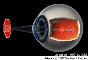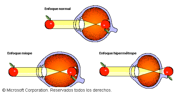 Los rayos de luz que entran en el ojo son refractados, o reflejados, al pasar por el cristalino. En una visión normal, los rayos de luz se enfocan justo sobre la retina. Si el globo ocular es demasiado ancho, la imagen se enfoca más cerca que la posición donde está la retina. Esto se llama miopía, es decir, una persona corta de vista que no distingue con claridad los objetos distantes. La condición contraria se llama hipermetropía; se produce cuando los globos oculares son demasiado estrechos. En este caso, una imagen enfocada de forma correcta queda detrás de la retina. Estas condiciones también se pueden dar si los músculos oculares son incapaces de variar la forma del cristalino para que enfoquen los rayos de luz de forma correcta.