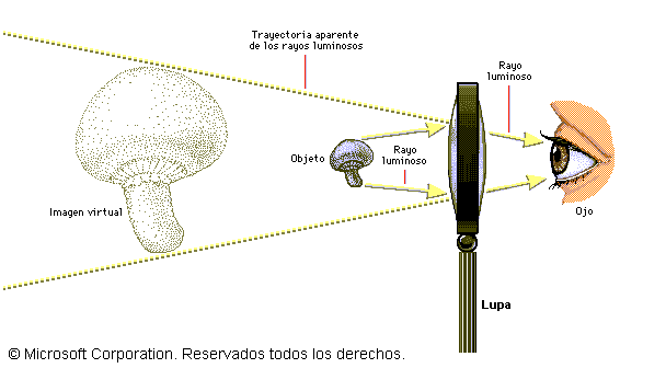 Una lupa es una lente convexa grande empleada para examinar objetos pequeños. La lente desvía la luz incidente de modo que se forma una imagen virtual ampliada del objeto (en este caso un hongo) por detrás del mismo. La imagen se llama virtual porque los rayos que parecen venir de ella no pasan realmente por ella. Una imagen virtual no se puede proyectar en una pantalla.