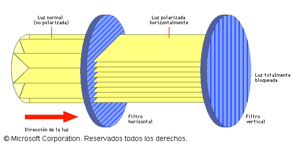 La luz polarizada está formada por fotones individuales cuyos vectores de campo eléctrico están todos alineados en la misma dirección. La luz normal es no polarizada, porque los fotones se emiten de forma aleatoria, mientras que la luz láser es polarizada porque los fotones se emiten coherentemente. Cuando la luz atraviesa un filtro polarizador, el campo eléctrico interactúa más intensamente con las moléculas orientadas en una determinada dirección. Esto hace que el haz incidente se divida en dos haces con vectores eléctricos perpendiculares entre sí. Un filtro horizontal absorbe los fotones con vector eléctrico vertical (arriba). Un segundo filtro girado 90° respecto al primero absorbe el resto de los fotones; si el ángulo es diferente sólo se absorbe una parte de la luz.