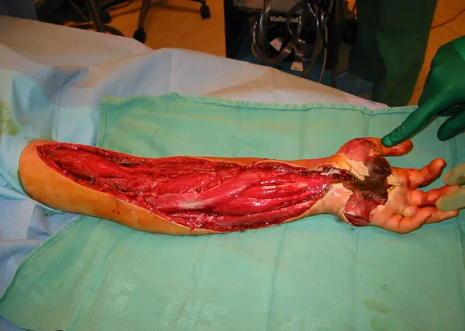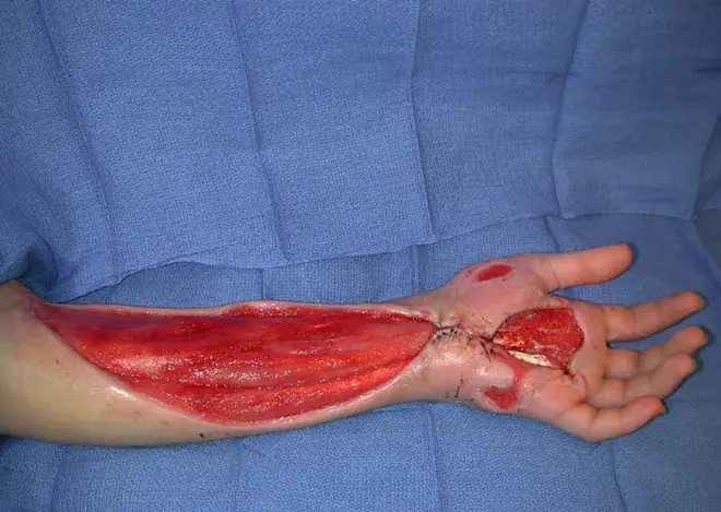 El defecto cutáneo que ha quedado es muy grande por lo que se requiere un injerto de piel para reeplazar la original pérdida en el proceso de salvar el brazo.