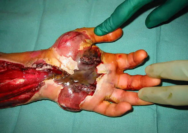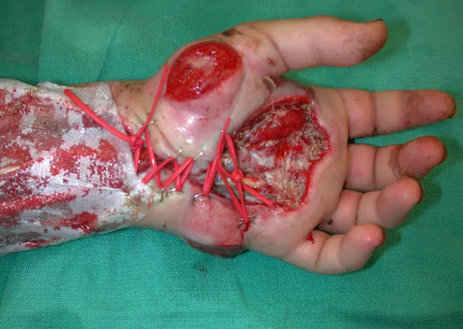 La mano ha pérdido tanto tejido que ha adoptado una posición contraida, el pulgar esta casi inservible y debe ser corregido o será irrecuperable.