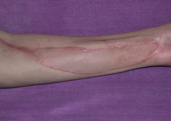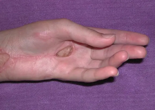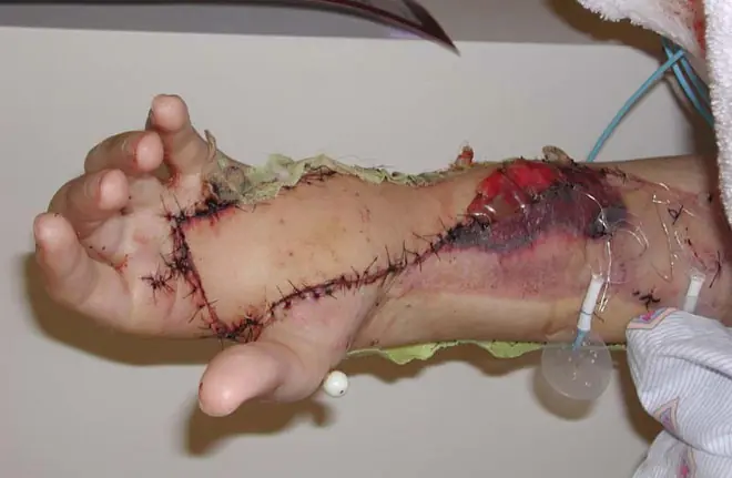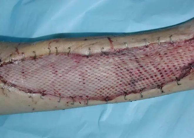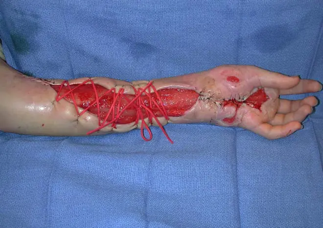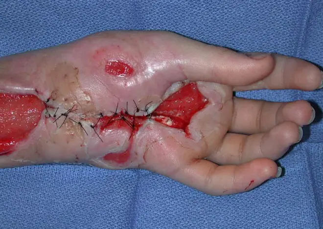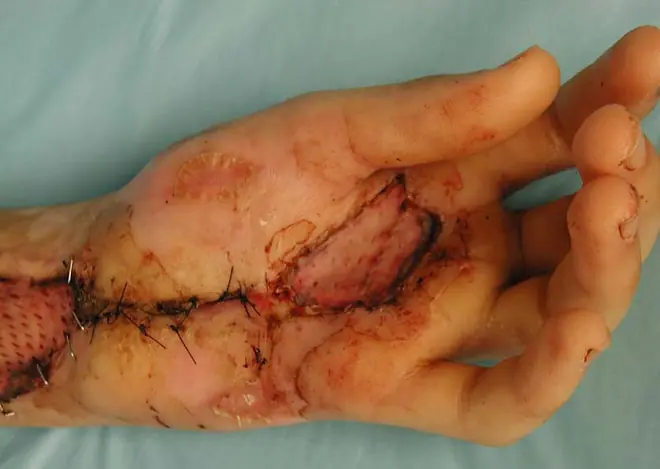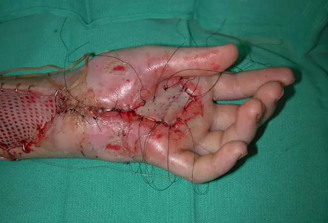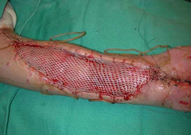Los injertos de piel en la palma y el antebrazo con aspecto de "malla" pertenecen al propio paciente y tienen este aspecto para optimizar la superficie que puede cubrir.