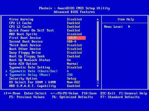 •Entra las opciones presentes, buscaremos “First Boot Device”, y elegirás CD/DVD.