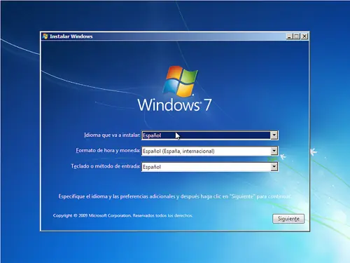 3. Finalmente veremos la pantalla de presentación de Windows 7, en donde nos preguntaran el idioma y demás opciones. Seleccionamos el español y luego terminamos de configurar la hora y el teclado