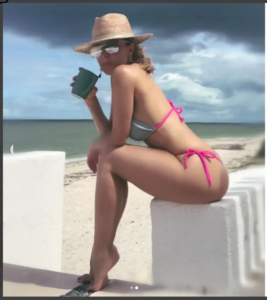 "Esperando la tormenta”, es la leyenda que acompaña la imagen, donde Fey presumió su figura en un diminuto bikini.