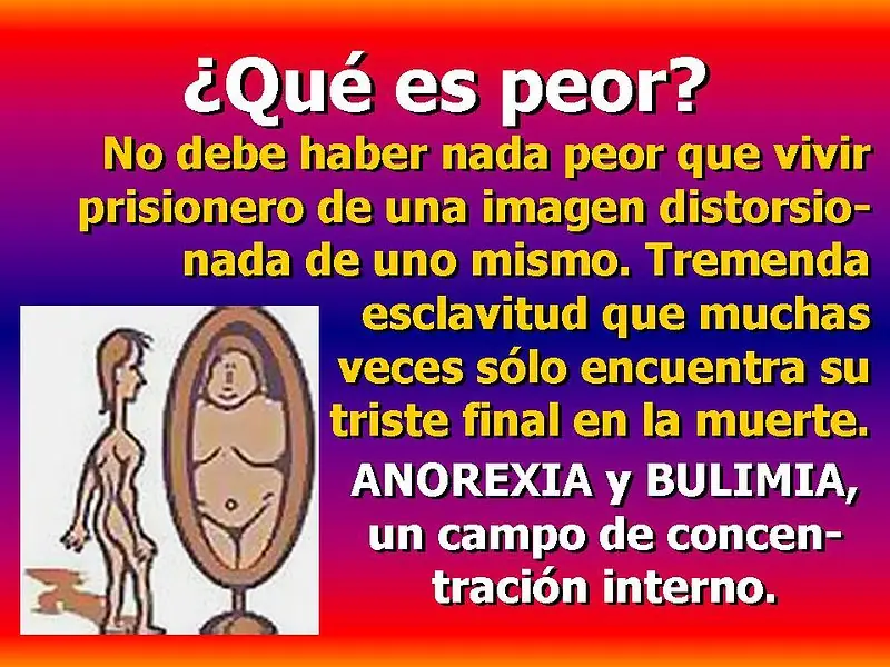 Bulimia, desorden alimenticio causado por la ansiedad y por una preocupacion excesiva por el peso corporal y el aspecto fisico.