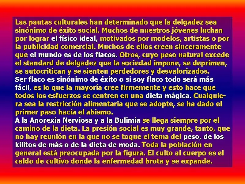 Miedo intenso al aumento de peso o a ser obeso incluso con peso inferior al normal.