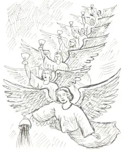 19:17 Y vi a un ángel que estaba en pie en el sol, y clamó a gran voz, diciendo a todas las aves que vuelan en medio del cielo: Venid, y congregaos a la gran cena de Dios,
