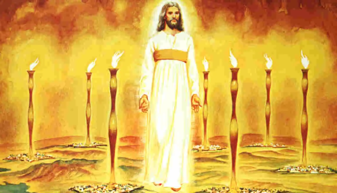 1:13 y en medio de los siete candeleros, a uno semejante al Hijo del Hombre, vestido de una ropa que llegaba hasta los pies, y ceñido por el pecho con un cinto de oro.