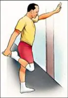De Pie, estiramiento de cuádriceps, 10 veces. De pie, con la rodilla operada doblada, lleve lentamente la pierna hacia las nalgas, sienta como se estira la parte delantera de la pierna. Mantenga esta posición durante 5 segundos. Repita 10 veces.
