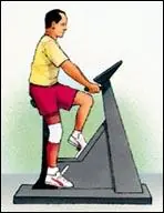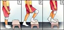 Suba un escalón, hacia delante, 10 veces. Súbase a un banco de 6 pulgadas de altura, comience con la pierna operada, bájese y vuelva a la posición inicial. A medida que recupere la fuerza, aumente la altura de la plataforma a la que se sube. Repita 10 veces.