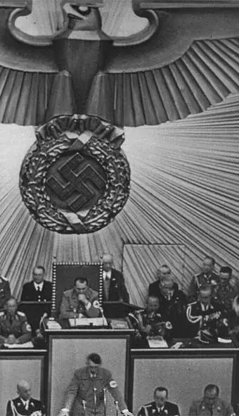El ascenso al poder. Hitler apoyó, en primer lugar, la elección de Hindenburg a la Presidencia de la República (1925) y llegó a obtener en tres elecciones sucesivas (1928, 1930 y 1932) la mayoría relativa en el Reichstag, gracias a la alianza con todos los movimientos de la derecha antidemocrática (Frente de Harzburg, 1931) para terminar siendo elegido, el 30 de enero de 1933 como Canciller del Reich. La crisis económica y social que minaba los cimientos de la frágil democracia alemana había conducido a la gran industria, las altas finanzas y al Estado Mayor a confiar al clásico hombre fuerte la reorganización autoritaria y antidemocrática del Estado alemán. Ya en el poder, Hitler se apresuró a poner en práctica su programa político basado en el control de todos los aspectos de la vida pública por los nazis, al tiempo que vaciaba de contenido las instituciones democráticas, rearmaba al ejército e iniciaba una campaña contra los judíos. Su agresiva política exterior, que buscaba recuperar los territorios arrebatados a Alemania a raíz de la firma del tratado de Versalles, incrementó la tensión internacional hasta el punto de conducir a la guerra, cuando Alemania invadió Polonia en septiembre de 1939. En la imagen, Hitler anunciando en el Reichstag la ocupación de Austria en marzo de 1938.