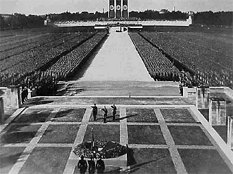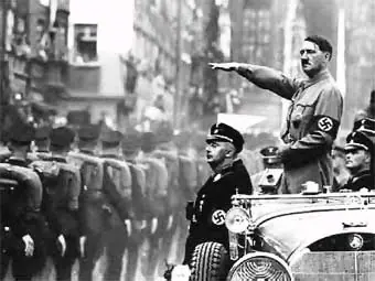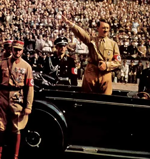 Fenómeno de masas. El culto al Führer, al conductor, constituyó la nota básica del estado nazi. El saludo formulario y reglamentario "Heil Hitler" fue inventado, según Toland, por Rudolf Buttmann hacia 1925, tras la salida de la prisión; pero su difusión se debió a Goebbels, quien consideró que la repetición en todos los actos contribuiría a convertir al jefe del partido en el caudillo indiscutido. Una vez convertido en dictador de Alemania, esta exaltación alcanzó su paroxismo en las grandes paradas del partido en Nuremberg, y no sólo en el momento en que en la gran tribuna señoreaba con gritos estridentes los micrófonos. La descripción de su intérprete Paul Schmidt lo presenta como dueño de las calles, pastor de las muchedumbres en las aceras. Su coche circulaba lentamente por los barrios viejos durante más de una hora, en medio de aclamaciones de la multitud amontonada al borde de las calzadas: "Las multitudes extáticas, rompiendo en jubilosas aclamaciones ante la aparición de Hitler, ofrecían un cuadro impresionante. Nunca olvidaré la expresión de aquellos rostros; las gentes le miraban extasiadas con una entrega casi bíblica... como si estuviesen hechizadas. Yo lo llamaría paroxismo colectivo. Muchos extendían los brazos en pleno delirio, le apostrofaban enardecidos con alaridos y vítores.