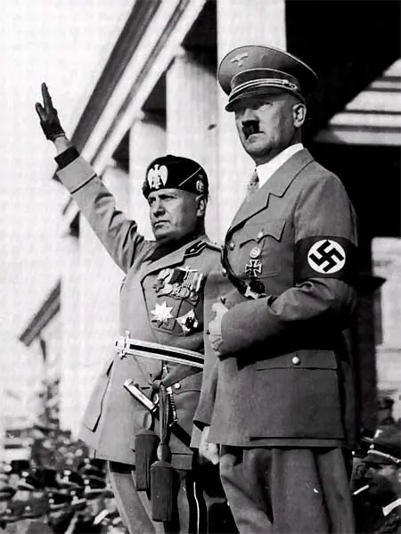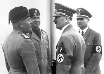 Con Mussolini. ¿Quién fue realmente Adolf Hitler? ¿Un loco perverso, un espíritu delirante, un megalómano insaciable o una simple víctima de los acontecimientos? A mediados de los años setenta, un profesor universitario estadounidense realizó una interesante prueba a sus alumnos. Tras entregarles una copia del testamento del Führer sin firma alguna, les pidió que imaginasen al autor. Amparada en el anonimato, la personalidad de Hitler fue calificada de profundamente honesta, sensible e incluso admirable. Esta paradoja quizás explique por qué Hitler llegó a ser un líder querido e indiscutido para muchos que no reconocieron sus horribles actos hasta que fue demasiado tarde, pues no hay duda de que en su complejo carácter no faltaba una innata capacidad para atraer a las masas y un considerable poder de sugestión. En la imagen, Hitler con el otro gran líder fascista europeo, Benito Mussolini.