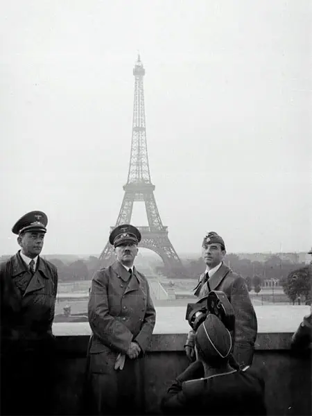 La guerra. En los años treinta del siglo XX, ni Alemania, ni Italia, ni Japón, ni la URSS estaban satisfechas con las condiciones impuestas por la conferencia de paz de París de 1919. Estos países iniciaron una política expansionista y de desquite sin respetar dichos acuerdos. En contrapartida, el temor a una nueva guerra y los conflictos internos, provocados o aumentados por la depresión económica de 1929, frenaron a las democracias. Hitler, aprovechándose de la coyuntura internacional, llevó adelante su plan de crear la Gran Alemania. En agosto de 1939 Hitler selló con la URSS el Pacto de Munich de no agresión. Sintiéndose, pues, segura respecto a la URSS, el 1 de septiembre de 1939 Alemania invadió Polonia. Como respuesta, Francia y el Reino Unido declararon la guerra a Alemania el 3 de septiembre: la Segunda Guerra Mundial había comenzado. Ocupada Polonia, Hitler lanzó a sus ejércitos (contaba con más de un millón de hombres, divisiones acorazadas y la potencia aérea de la Luftwaffe) sobre Dinamarca y Noruega en abril de 1940. Vencidas éstas, atacó los Países Bajos, Bélgica, Luxemburgo y, finalmente, Francia, a la que venció en Dunkerque (mayo de 1940). Poco a poco, los alemanes se adueñaron de casi toda Francia: París caía el 13 de junio y Verdún dos días después. Sólo el sur quedó libre de la ocupación. Allí se estableció el gobierno de Vichy, presidido por el mariscal Pétain (1856-1951), que inauguró un régimen de talante autoritario y colaboracionista. Hitler había conseguido su objetivo en el occidente europeo: apoderarse de la costa atlántica para, desde ella, lanzarse contra el Reino Unido y, derrotado éste, proseguir su expansión hacia el este. Pero tras la fallida invasión de Rusia y la entrada de los Estados Unidos en la guerra, los ejércitos alemanes cosecharon una derrota tras otra y el sueño megalómano de Hitler comenzó a desvanecerse. En la imagen, Hitler tras la ocupación de París.