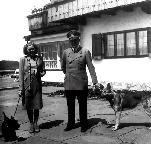 Con Eva Braun. El Führer no parecía ser un hombre de carne y hueso; se le desconocía toda relación privada, nada se sabía de sus diversiones, sus amistades o sus debilidades íntimas; tan sólo sus colaboradores Hess, Goebbels, Göring y otros que más tarde ocuparán los cargos importantes del Reich tenían acceso a su persona y lo acompañbaan como sombras. Su principal afición era tomar el té con su gran amor, Eva Braun, a la que había conocido en Berchtesgaden en 1929, cuando ella contaba diecisiete años. Se trataba de una joven rubia y sonrosada, de aspecto fresco y sano, tal como le gustaban a Hitler y como convenía a su ideal ario. Su carácter alegre y despierto hizo que esta mujer se convirtiese en compañera inseparable del Führer, aunque nunca llegaría a ser oficialmente la primera dama de Alemania porque el mito del dictador solitario, abnegado y absorbido en cuerpo y alma por su pueblo no admitía una esposa. Tan sólo al final de la guerra, cuando fuera de los refugios subterráneos de la Cancillería del Reich en Berlín tenía lugar la hecatombe, Adolf Hitler contrajo matrimonio con Eva Braun. Era el 29 de abril de 1945, el mismo día en que redactó su testamento. Veinticuatro horas más tarde, Hitler y su mujer estaban muertos: él la envenenó con una cápsula de cianuro y luego se disparó un tiro en la boca. Física y psíquicamente destrozado, el Führer no quiso asistir al catastrófico fin de su obra y mucho menos caer en manos de sus enemigos.