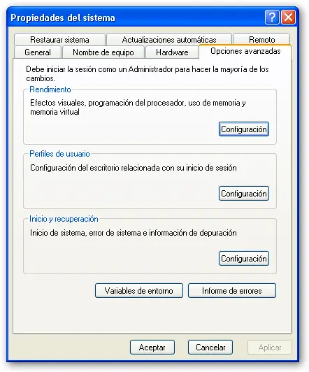 Inicio/ Clic en Mi PC con el secundario/ Clic en Propiedades/ Opciones Avanzadas/ Configuración.