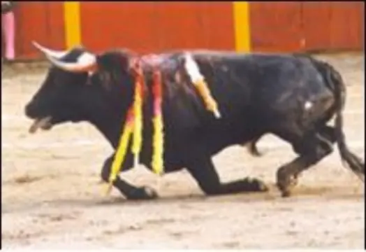 La tortura sigue: el toro, en un intento desesperado por sobrevivir, se resiste a caer, y suele encaminarse penosamente hacia la puerta por la que lo hicieron entrar, buscando una
