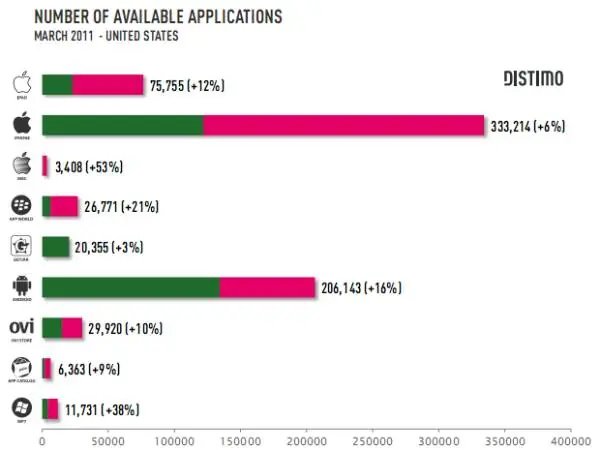 Distimo sostiene que la mayoría de las tiendas han tenido un crecimiento moderado durante los últimos meses, pero en general su crecimiento volvió a despuntar en marzo. Aquí están las tiendas de aplicaciones en orden descendente por crecimiento: Mac App Store, Windows Phone Marketplace, BlackBerry App World, Android Market, App Store para el iPad, Nokia Ovi Store, Palm App Catalog, App Store para el iPhone, y GetJar.