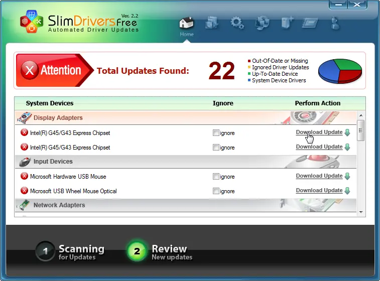 Hablando de la actualización de los controladores, debes asegurarte de que todos ellos están al día. SlimDrivers hace esta tarea muy fácil ya que revisa las listas de Windows y los controladores que necesitan ser actualizados. Si te registras (que es gratis, también), encontrará los controladores y ejecutará la actualización para ti. Incluso ofrece crear un punto de restauración antes de cada actualización. No actualiza todos los controladores a la vez, sin embargo, es eficiente.