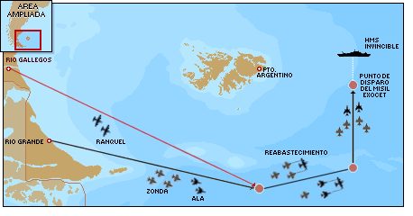 Cargados "a full", los aparatos se alejaron de los Hércules y adoptaron la formación de ataque: los dos Súper Etendard adelante separados una milla uno de otro; detrás de cada Súper Etendard, dos Skyhawk.